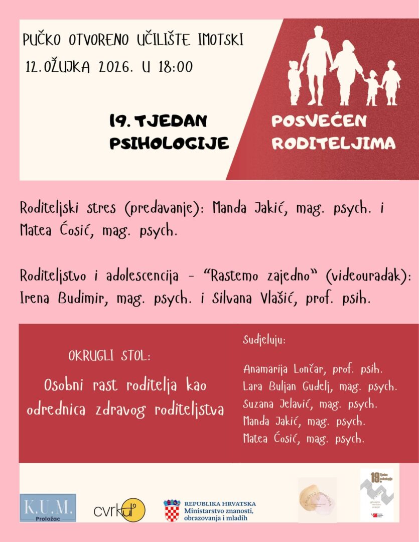 Predavanje na temu „Roditeljski stres“ održat će psihologinje Manda Jakić i Matea Ćosić, dok će videouradak „Roditeljstvo i adolescencija – Rastemo zajedno“ predstaviti psihologinje Silvana Vlašić i Irena Budimir.